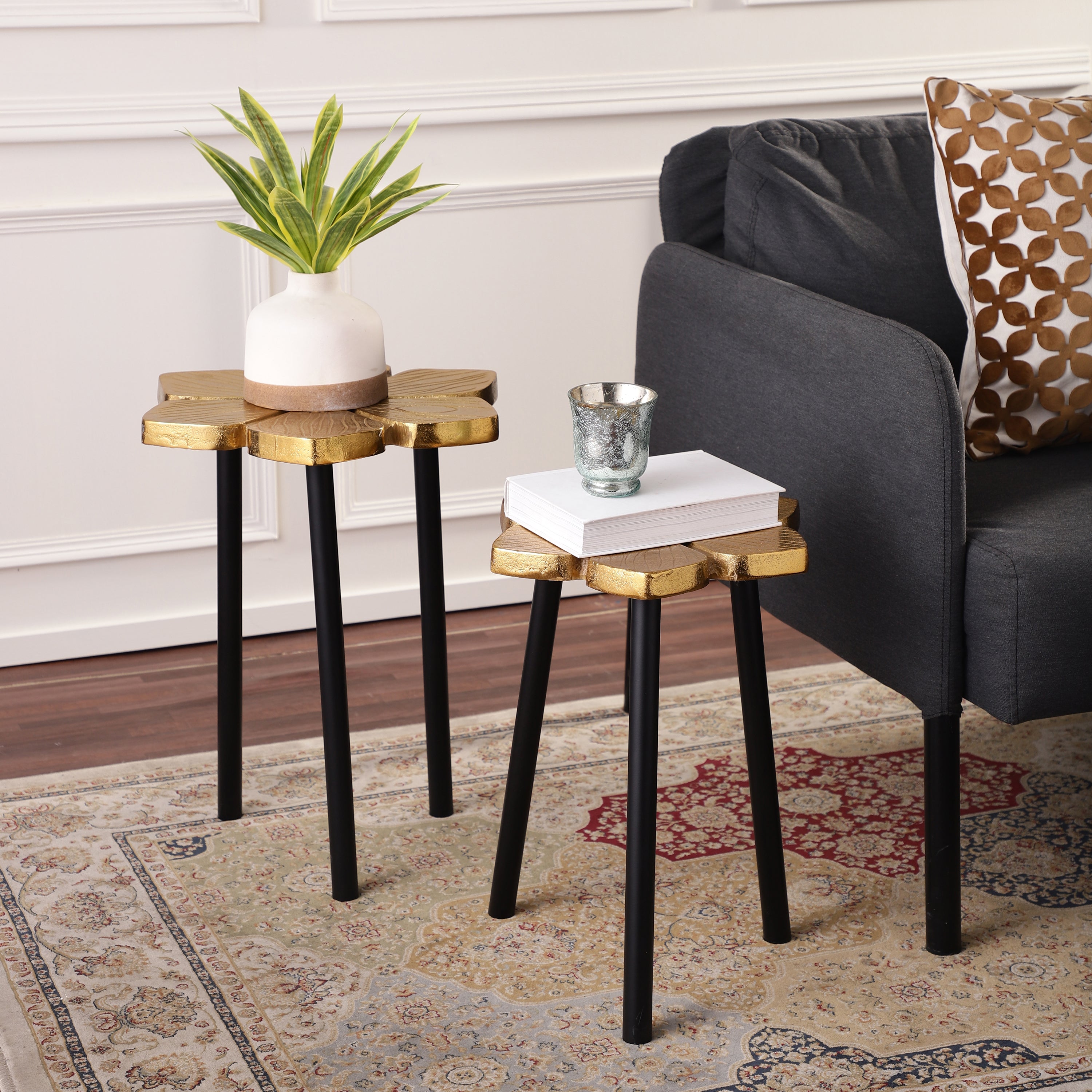 Add a touch of sophistication to your space with this stunning set of two flower-shaped metal tables. Featuring intricately designed petal tops finished in a luxurious antique gold hue, these tables are the perfect blend of style and durability. Their sleek black metal legs provide a striking contrast, enhancing their modern yet timeless appeal. Ideal as accent tables for your living room, bedroom, or patio, their compact yet eye-catching design makes them versatile for any décor. Whether you're showcasing decorative items or using them as side tables, these pieces are sure to impress. Elevate your home with this chic and functional table set today!
