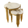 Make a dramatic statement in your home with the Sylvia Nesting Tables, a masterpiece of modern luxury and sculptural craftsmanship. Featuring pristine white marble tops with subtle veining, each table is elevated on a striking cluster of vertical gold-finished rods that create a cascading, architectural silhouette.
